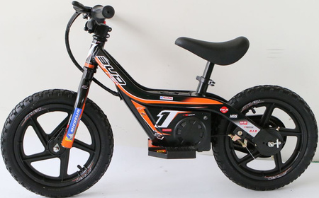 The mini Electric push bike 12" or 14" is the perfect toy for the kids who want to become the future champions ! For kids from 3 to 6 years old. Delivered with charger. Bridging the gap and simplifying the transition from a balance bike to a motorcycle. The perfect way to introduce the skills of throttle control and balance to childre.Motor: Output max power: 100w-Max torque: 5.9N.m-Speed: 10km/h, Tire: front and rear 1/2*2 1/4-12- Wheel: 5 spoke plastic-Seat height: 400mm-Weight: 8.6kgs-Frame: aluminium TIG welded-Fork: Steel-Battery: 25.2V 4Ah li-ion battery-Dimension: 1000mm*520mm*535mm. Available now without personnal custom, and about 8/10 days with graphics with personal name and number rider (add +34.90 euros for custom graphics). All the spare parts of our Electric balance bike are available at BUD racing.Do you need help? Do you have any questions?Ask a question and we'll respond promptly, publishing the most interesting questions and answers for others.